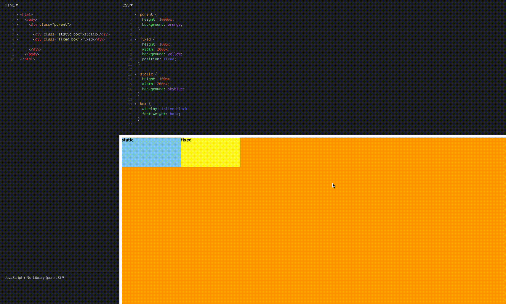 Sticky 는 fixed 와 비교해서 생각하면 조금 더 쉬울 것 같아 fixed 와 sticky 두개 박스를 준비했습니다.